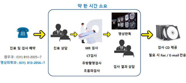 검사 가능한 시간은 평일은 오전 9시부터 오후 5시입니다. (점심시간 오후1시 ~ 오후 2시) 토요일은 MR검사만 가능합니다 (오전9시부터 12시까지). 문의전화는 원무과 031) 810-2005~7 영상의학과 031) 810-2056~7입니다.