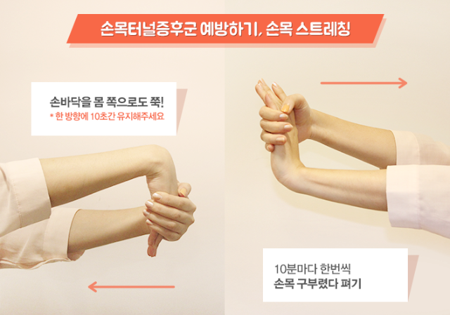 수근관증후군은 손목의 잘못된 자세와 무리하게 반복된 동작으로 발생한다. 재활의학과에서는 손목의 위치를 조정해 손목에 가해지는 압력을 줄이는 손목운동을 시행한다. 증상을 유발하는 손목 동작을 교정하고 생활환경을 개선해, 질병을 예방하고 완화하는데 일차적 목적을 둔다. 평소 컴퓨터를 사용할 때 손목이 굽혀지지 않도록 평행을 유지한다. 장시간 마우스를 사용하는 것도 피한다. 손빨래처럼 손목에 무리를 많이 주는 가사활동도 가급적 피해야 한다. 부득이하게 손을 계속 사용해야한다면, 손목 보호대를 착용하고 양손을 균등하게 사용한다. 대략 50분 작업 후에 10분 정도 손을 쉬는 것도 중요하다. 또한 한쪽 팔을 수평으로 뻗어 손가락과 손등을 반대쪽 손으로 당기며 스트레칭을 자주 해주도록 한다. 손등과 손바닥을 마사지하는 것도 도움이 된다. 만약 손이 저리고 통증이 느껴지면, 하던 일을 잠시 중단하고 휴식을 취한다. 따뜻한 물에 손을 넣어 10분가량 주먹을 쥐었다 폈다 하는 것도 증상 완화에 도움이 될 수 있다. 닥터클리닉 1. 수근관증후군은 손목을 주물러주면 일시적으로 저리거나 아픈 증상이 완화될 수 있다. 그 때문에 증상을 방치해두는 경우가 많다. 그러나 참거나 방치하면, 가벼운 증상도 심각한 질환으로 이어질 수 있다. 평소 손목이 저리고 통증이 심해 잠을 설치거나, 손목의 무감각과 심한 통증이 반복되는 사람이라면 한번쯤 수근관증후군을 의심하고 재활의학과 전문의를 찾아 진료를 받는 것이 좋다. 닥터클리닉 2. 알아두면 좋은 손발 저림 진단법 * 발가락에 면봉이나 바늘을 이용하여 닿는 느낌이나 따가운 느낌을 손가락과 비교해 보아 뚜렷한 감소가 나타나면 감각신경의 손상이 있음을 나타내는 지표 중 하나이다. * 손목을 90도 정도 구부리고 약 1분 이내에 손가락의 끝이 저리는 현상이 나타나면 손목에서 신경이 눌리거나 신경을 가는 혈액 순환이 잘 안 되는 것일 수 있다.