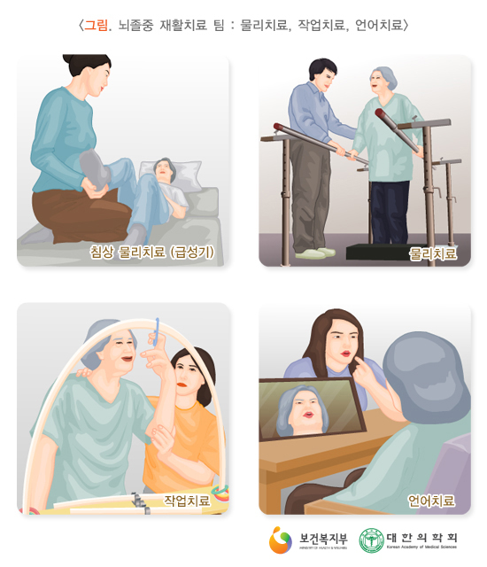 일단 뇌세포의 손상이 발생하면 다양한 증상을 초래할 수 있습니다. 운동장애, 감각장애, 실어증, 의식장애 등의 신경증상이 갑자기 또는 서서히 발생하고 많은 경우에 후유장애가 남아 일상생활에 장애를 초래하게 됩니다. 뇌졸중 재활은 다양한 신경학적인 장해를 조기에 평가하여 가장 적합한 치료를 각 개인에게 맞추어 진행함으로써 합병증과 남을 수 있는 장애를 최소화하는데 그 목적이 있습니다. 이를 통해 독립적으로 일상생활을 수행하고 보행이 가능하도록 함으로써 궁극적으로는 직업에 복귀하고 삶의 질을 향상시키고자 진행되는 일련의 과정들이라고 할 수 있습니다. 동영상 보기 : http://health.cdc.go.kr/health/mobileweb/content/group_view.jsp?CID=12C346C05B 일반적 재활치료 원칙 1. 재활치료 시작 시기 뇌졸중 환자의 재활치료는 급성기부터 시작됩니다. 급성기는 뇌졸중이 발생하고 신경학적으로 안정이 된 시점, 즉 뇌졸중 발생 후 약 48시간에서 72 시간 내를 말합니다. 이시기의 재활치료의 목적은 뇌졸중 초기에 생길 수 있는 합병증을 예방하고 마비로 인해 할 수 없는 씻기, 옷 입기, 화장실 가기, 목욕하기 등의 일상생활 동작을 다시 수행할 수 있도록 하는데 있습니다. 또한 환자와 가족을 정서적으로 안정시키는 것도 중요합니다. 뇌졸중 초기부터 환자의 회복 정도와 신체적, 정신적 장애를 평가하여 기능회복을 최대화 하여야 합니다. 2. 재활치료 팀의 구성 재활치료는 여러 분야 전문가의 협동적인 접근이 가장 효과적이며, 이를 위해 초기에는 잘 조직된 뇌졸중 재활 치료시설 또는 재활 병동에서의 치료가 필요합니다. 뇌졸중 재활치료 팀은 재활의학과 전문의, 재활전문 간호사, 물리치료사, 작업치료사, 언어치료사, 사회사업가 등으로 이루어집니다.