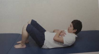 1) 편안하게 눕는다. 팔장을 낀 채로 손바닥을 어깨 위에 둔다. 무릎은 45도 정도 세운다. 2) 머리와 어깨를 들면서 아랫배에 힘을 준다. 등이 바닥에 납작하게 펴지지 않도록 주의한다. 윗몸을 일으킨 상태로 4초간 유지한 뒤 다시 내려간다. 10회 반복. 3단계 : 중둔근 강화운동